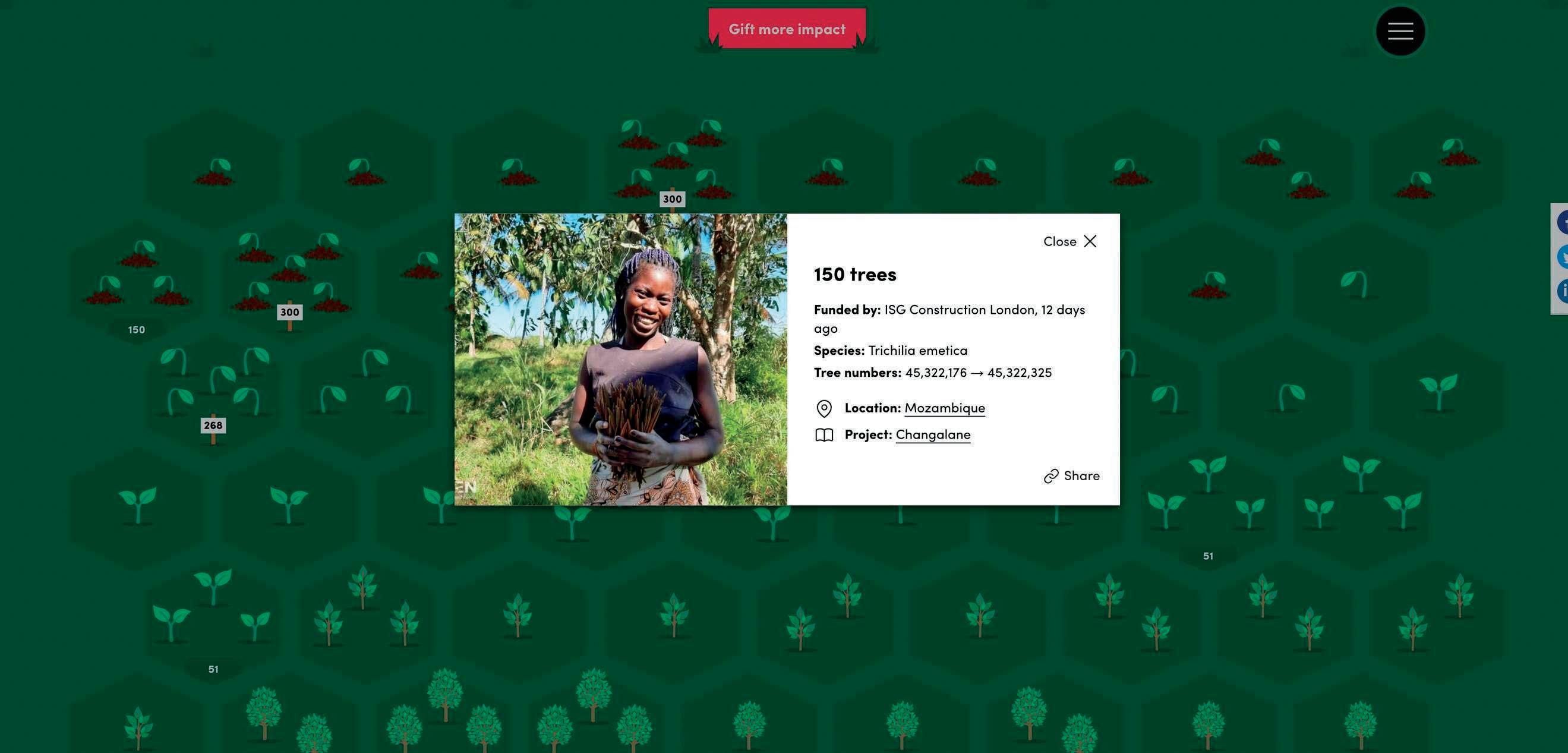 We make tree planting unique. Every tree we plant is trackable and traceable, we'll plant each tree in your company's name and you'll see where in the world we've planted your tree, its species, and other facinating facts.