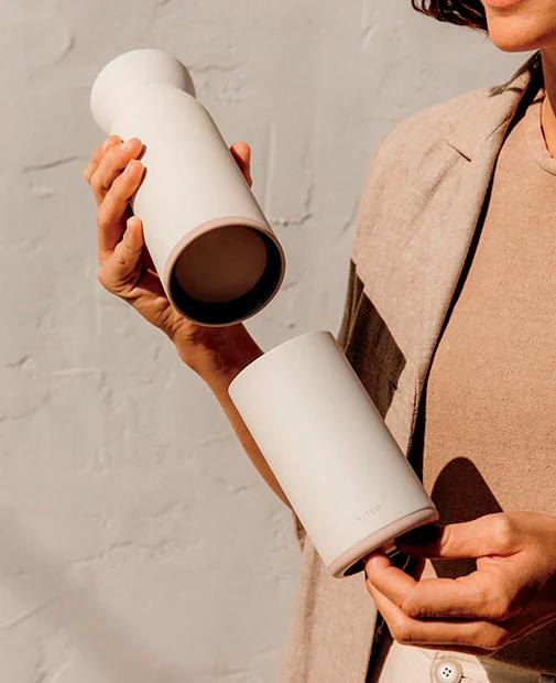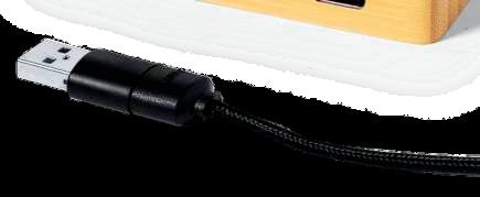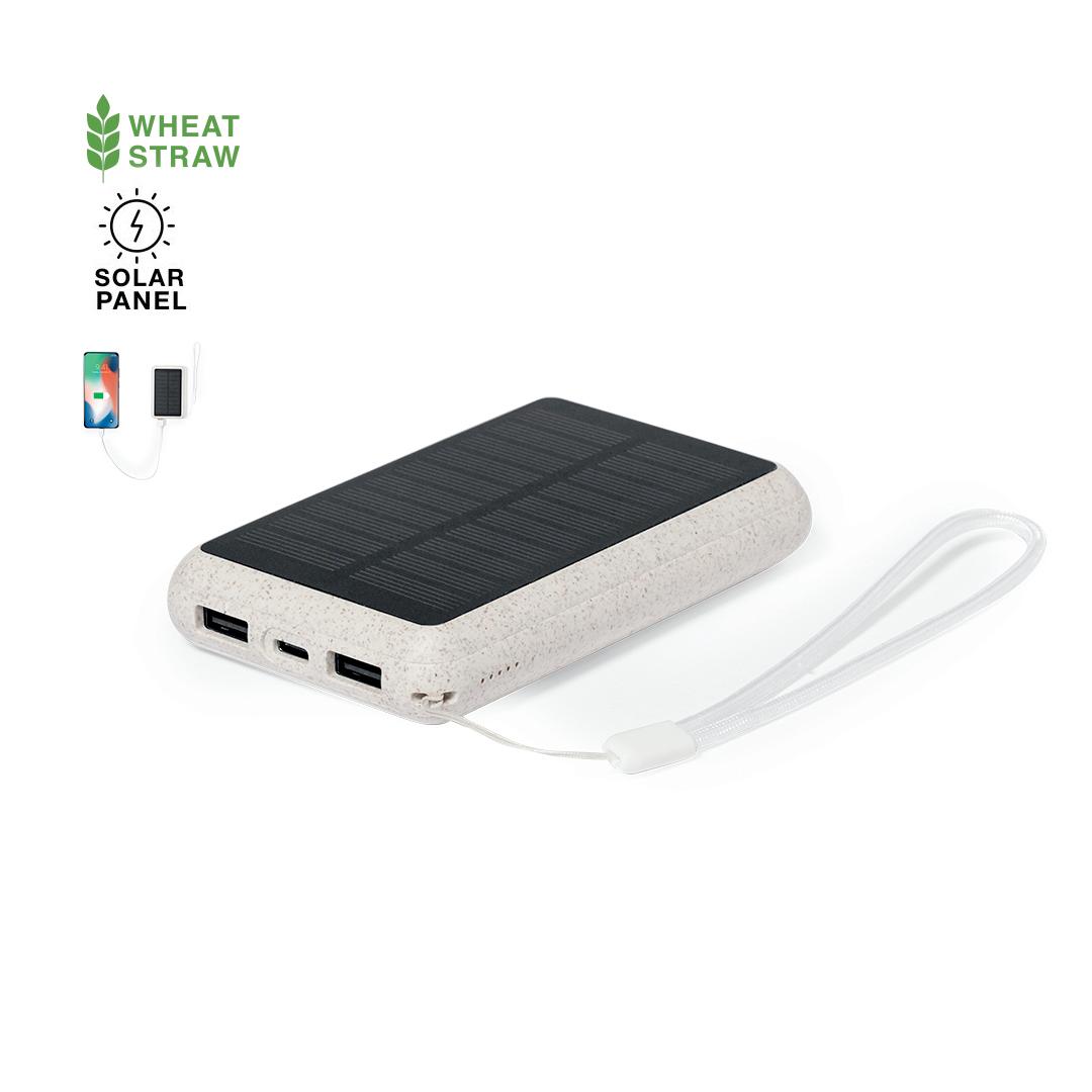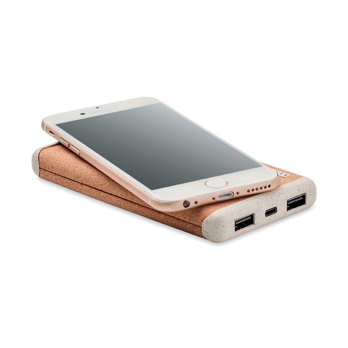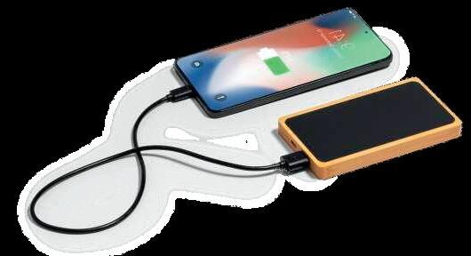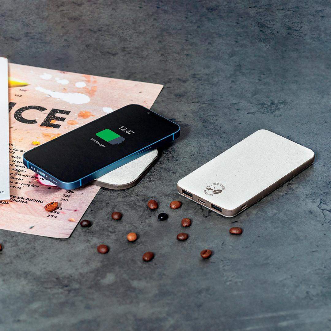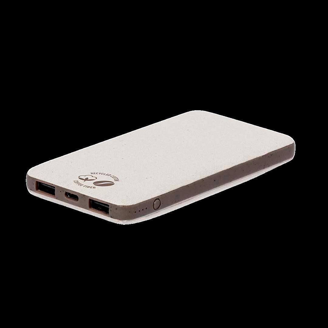 External 5,000 mAh auxiliary battery, made of coffee fibre and recycled cotton. With 2 USB outputs, micro USB input and dual Type-C input and output connection. Type C charging cable included, and presented in an individual kraft design box.