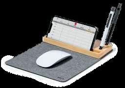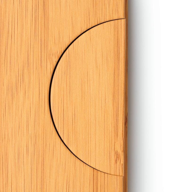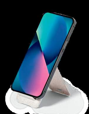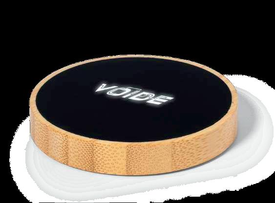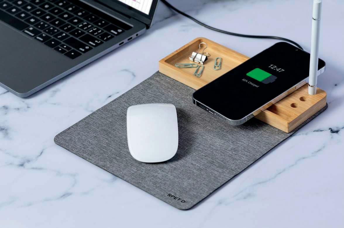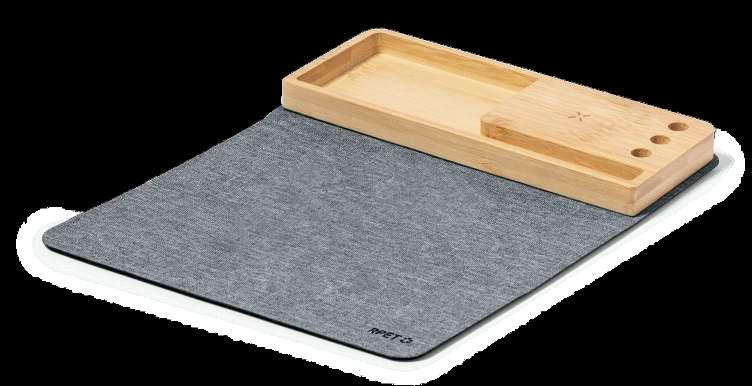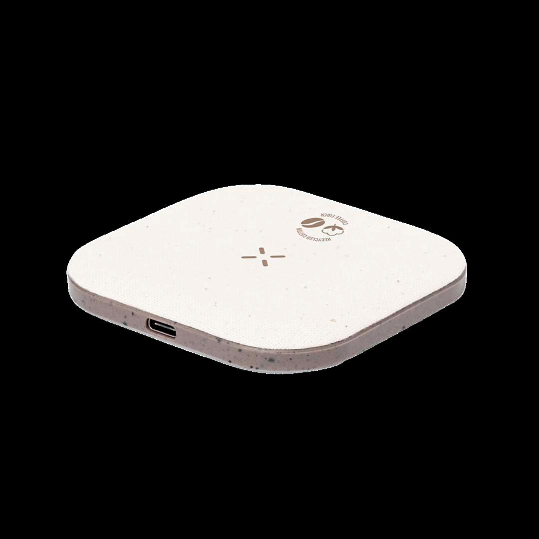 Wireless charger made of coffee fibre and recycled cotton. Non-slip base and compatible with devices equipped with Qi charging technology. Charging capacity of 15W