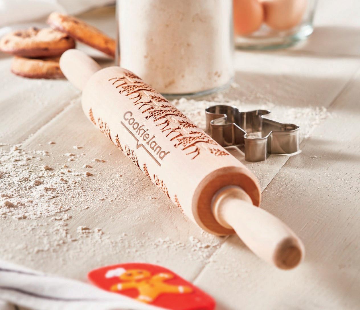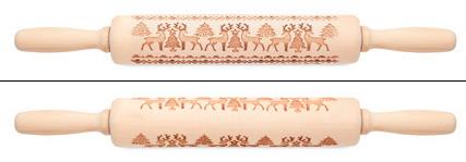 Wooden pastry rolling pin with debossed Christmas pattern.