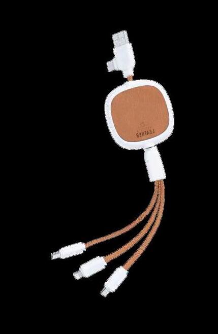 Centre piece with recycled leather cover and internal mechanism making the cable extendable. With Type-C and USB input connections and Type-C, Lightning and Micro USB outputs. 5V DC 2.4A