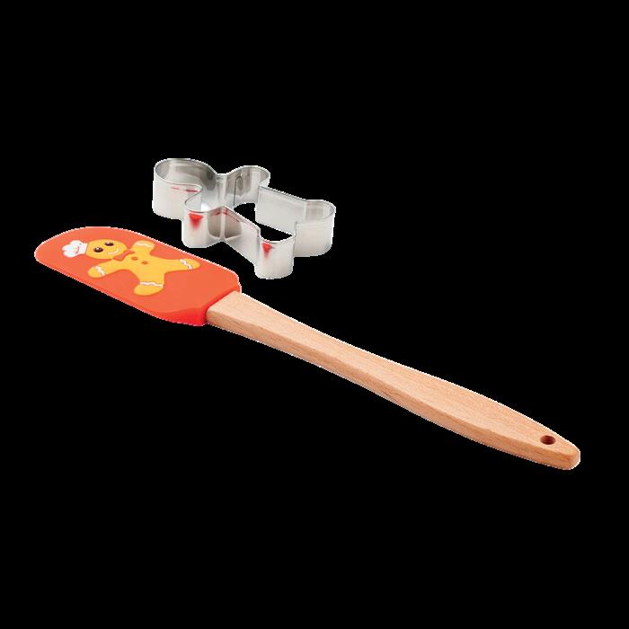 Christmas cookie set. Including 1 silicon spatula with cookie man design and with wooden handle and stainless steel cookie cutter.