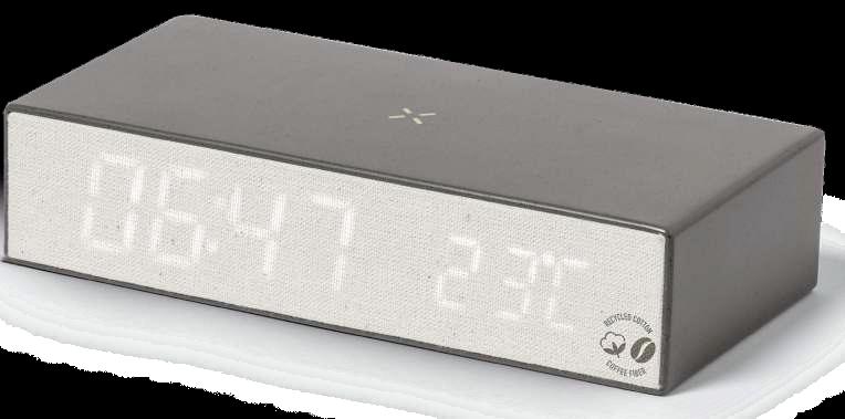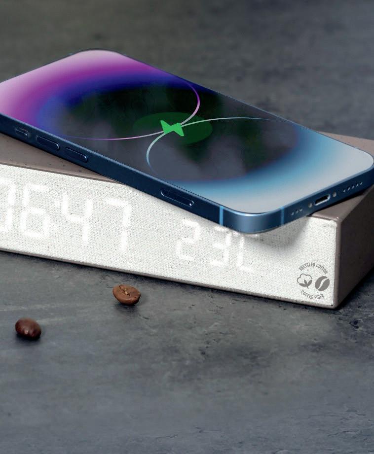 Multifunction clock with integrated 10W wireless charger. Made of coffee fibre and recycled cotton. Time function (12/24h), alarm, with adjustable light intensity. USB power supply. Compatible with devices equipped with wireless charging technology.
