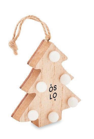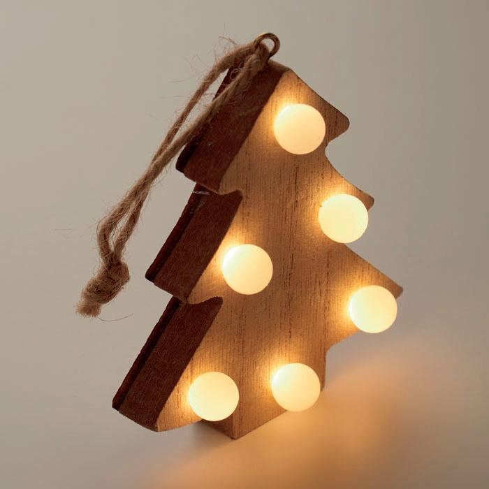 Wood (80% poplar wood and 20% weed wood) decorated tree with 6 LED light and hanging cord.