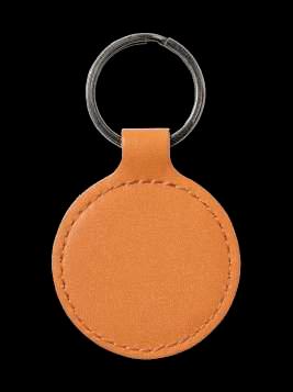Keyring made of recycled leather. In brown tone, with circular design and stitched finish.