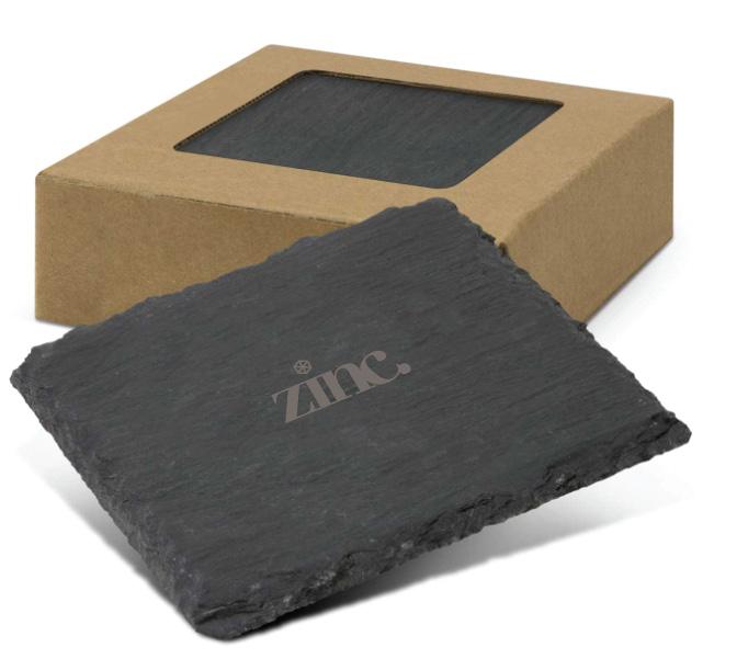 Deluxe natural slate coasters that have four soft non-slip and non-marking polyurethane pads on the base. The set is nicely presented in a natural unbleached cardboard gift box with a window to show off the brand.