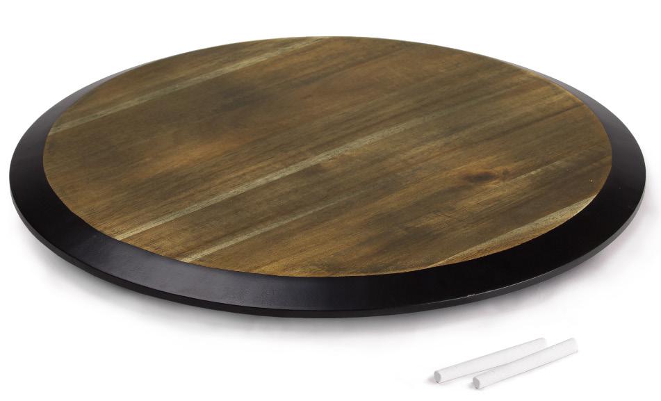 Certified) with FDA grade food oil finish. 18’ large circular rotating serving area with 1” wide chalkboard rim. 2-pcs of chalk for easy labeling. Supplied: in a black po ‘di fame two part presentation box.