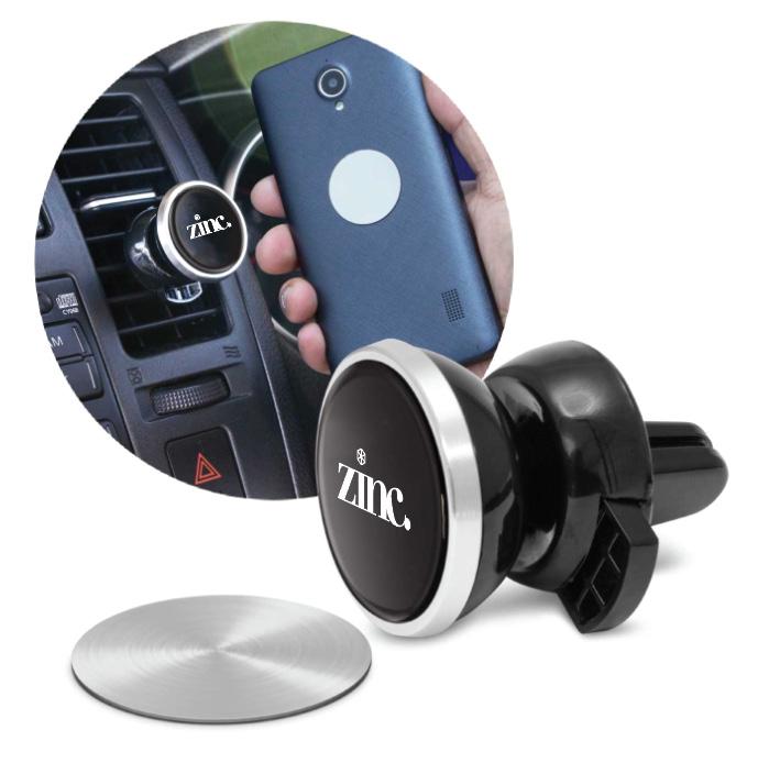 Magnetic phone holder that attaches securely to a car air vent with a spring-loaded clip to enable the phone to be used as a GPS. To establish the magnetic connection, the thin metal plate (included) is attached to the phone or phone case.