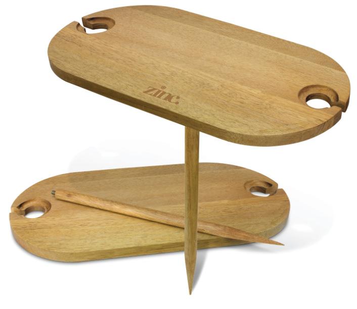 Unique two person wine table which is manufactured from acacia wood. It has a tough wooden spike which screws into the table top and pushes into the ground making it ideal for use in most outdoor situations including the beach. Both wine glasses are held securely by sliding the stems into the table and this leaves room for some snacks
