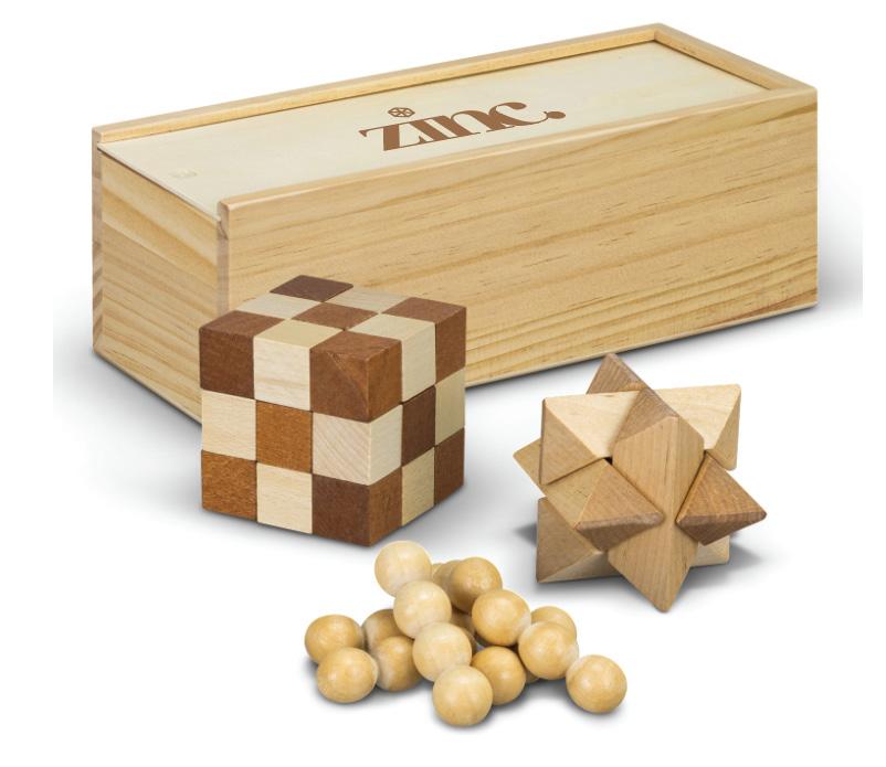 3 in 1 Wooden Brain Teaser Set presented in a wooden gift box with instruction leaflet. Branding is on the lid which laser engraves to a natural etch.