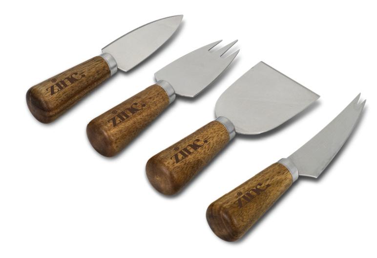 Functional set of four varied shaped cheese knives and utensils. Fitted with durable Acacia wooden handles and sturdy stainless-steel blades. The cheese knife set is presented in a natural gift box with a branded black sleeve.