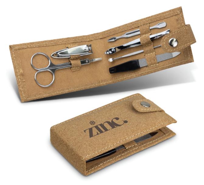 Handy six-piece stainless steel manicure set in a padded cork pouch. The pouch features a secure dome closure and smart matching stitching.