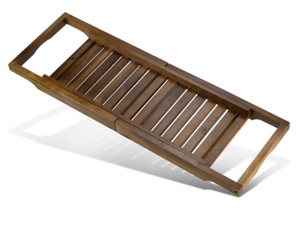 Deluxe bath caddy made from natural acacia wood, perfect for keeping essentials dry and within reach at bath time. The caddy extends to fit most tubs and is slatted to ensure it drains well if it gets wet. The caddy is presented in a natural gift box.