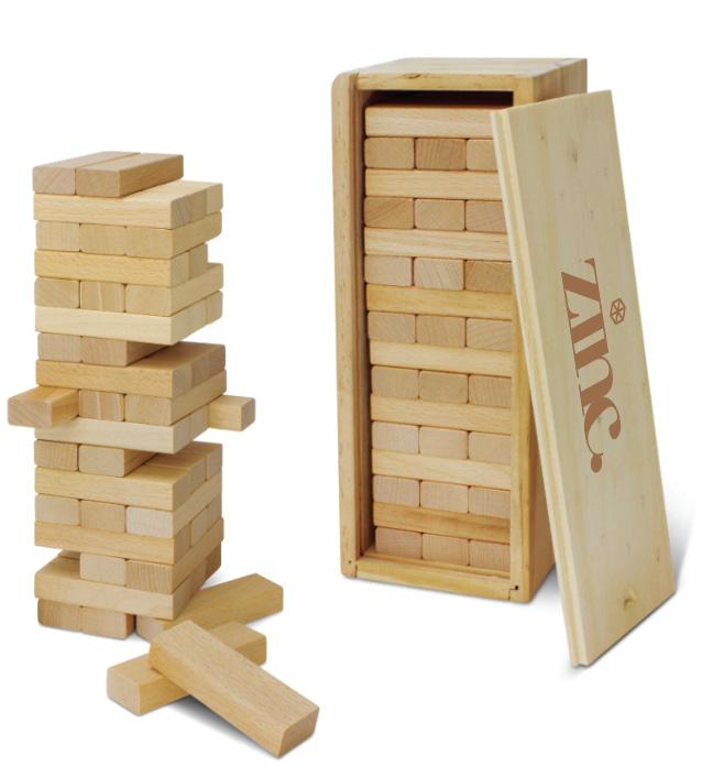 Tumbling Tower is a game of physical skill where a tower of 48 wooden blocks is constructed and players take turns removing one block at a time without causing the tower to fall. The game is beautifully presented in a wooden box with a tower stacker and instructions.