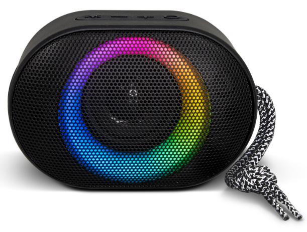 Powerful 7W outdoor Bluetooth speaker which is compatible with all mobile devices that support Bluetooth. Terrain is water-resistant, making it well suited for outdoor use. This compact speaker is perfect for music on the go, featuring an ambient light function with ten light display settings, a built-in microphone for phone calls, a safety alarm, and a woven carry handle.