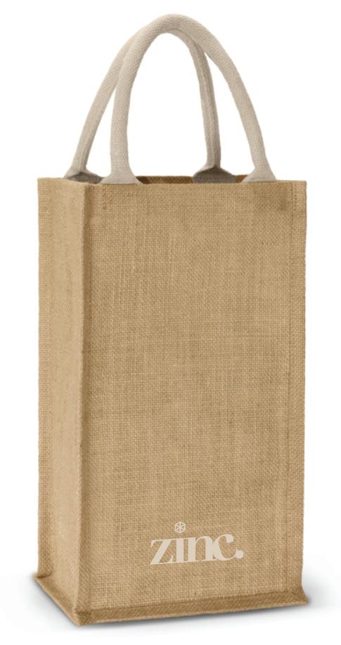 Two bottle wine carry bag with separated compartments. Made from laminated natural jute with unbleached woven cotton handles.