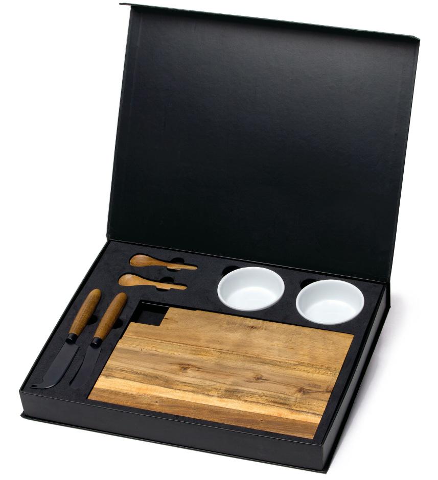 7-pcs set includes serving board with metal handle, 2 x spoons, 2 x bowls, 3.5” cheese knife and 3” spreader knife