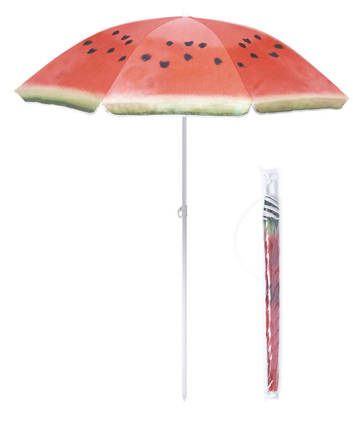 Colourful beach umbrella with fruit designs. 150 cm in diameter, with 8 panels in durable nylon and side skirts with piping. White coated metal tubes and adjustable in height. Presented in a transparent bag with shoulder strap. PVC Pouch.