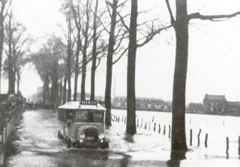 Overzicht vanaf de huidige Viaductweg. Rechts bebouwing aan de Nieuweweg. Een bus met opschrift 'Heerlen' baant zich over de ondergelopen weg. Datering: 1/1/1900 - 31/12/1920