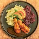 Stamppot andijvie met gehaktrol, spek en ui Drumsticks met aardappelpuree en rodekool Schnitzel strogano met krieltjes en sperziebonen Macaroni met kip en paprikaroomsaus
