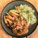 Boeuf bourguignon, gratin en rodewijn-champignons