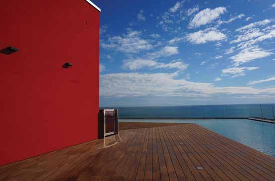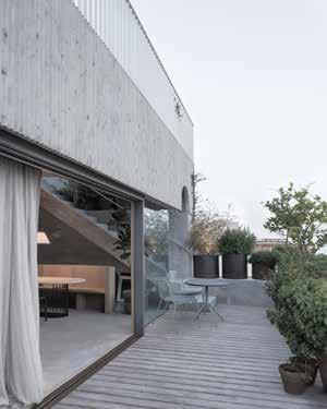 to give the illusion of a contnuous, fexible and comfortable space. Thanks to its side packing system, the 6-leaf folding window disappears into the steel bookcase wall designed by the architect, merging with the present geometries and materials. The dominant colors of the house are the colors of concrete and steel, and the light brown of the used wood essence, are also repeated on this two-tone element, with an external lacquering which makes it partcularly resistant to deterioraton due to atmospheric agents. The elegant merant wooden profle of the Klima 80 Slim collecton is also used for two other hinged openings which become, as in the case of the folding window, opportunites to extend the refned style of the house to all its components. The window does not lose its functonal and performance characteristcs but, on the contrary, acquires an aesthetc importance that amplifes and enhances the interior design.