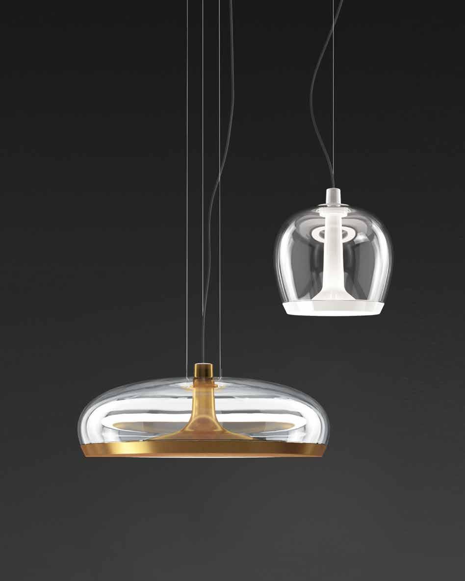 Saya est la nouvelle collecton de suspensions dessinée par Gio Minelli et Marco Fossat pour Fabbian. Ce projet s’inspire d’une grosse goute de rosée enfermée dans une “cage” de fls métalliques. La collecton se compose de plusieurs modèles de suspensions pour l’intérieur de trois diférentes formes. Les difuseurs en verre, soufés à l’intérieur des cages, sont proposés dans la version transparente ou en blanc brillant. La structure soutenant le verre est en métal, fniton brunie, dorée et chromée. Electrifcaton avec une tension de réseau pour des lampes LED.