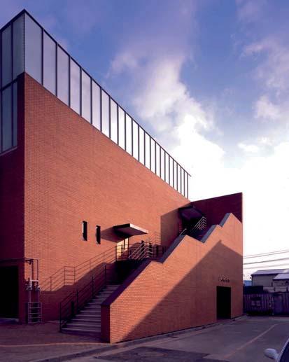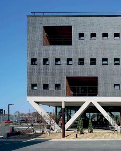 curved glass façade of the clinic in Jeongseon gently reacts to the small river nearby, while its resolute horizontality creates a painterly composition in harmony with the mountain peaks in the background. In contrast, the clinic in Hwaseong is a brick fortress, perhaps in reference to the 18th century fortress nearby, and its resolutely rectilinear forms and hermetically introverted posture exhibits an entirely