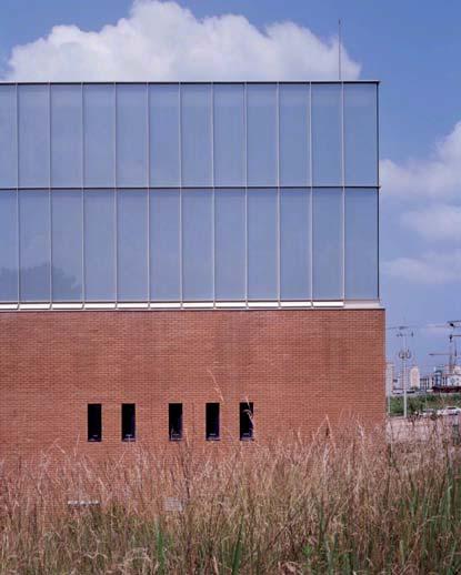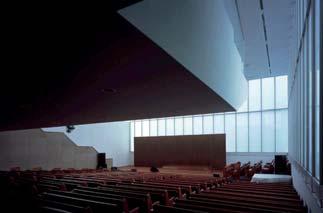 is the Yeain Church Education Center. More compactly arranged around a central gymnasium, the small private school is organized as a bundle of boxed classrooms tied together by a circular running track. Situated within an industrial neighborhood, the circular band of opaque glass and steel protects the school from the exterior noise and urban clutter while allowing an ample amount of natural light and air through well-positioned skylights, courtyards and terraces. Here the looping movement of students entirely takes over the interior scenes as well as its exterior form, in a dramatic contrast to old school buildings that discouraged students from roaming and